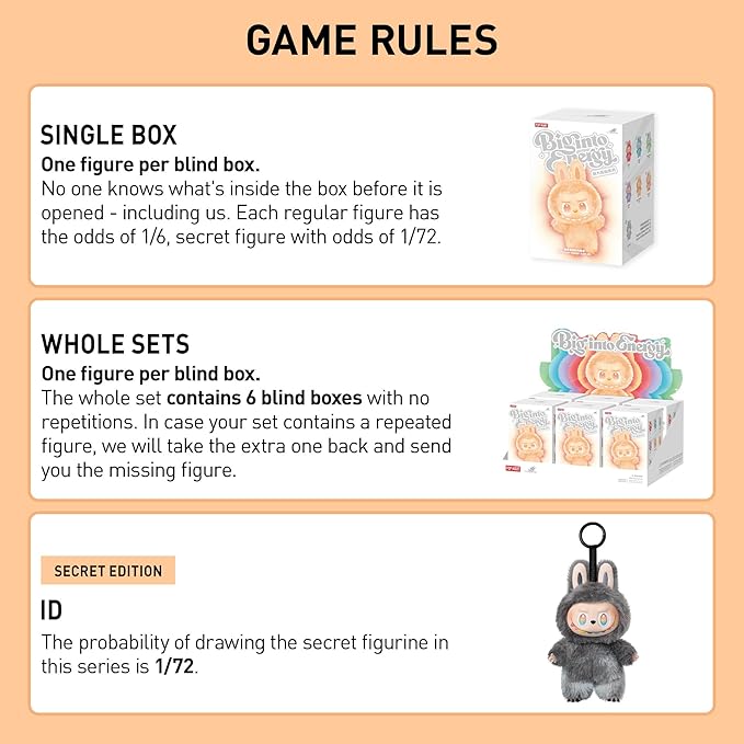 - Random Design: Blind boxes are fully random and we cannot accept requests for specific items. There chances of getting the secret edition are usually 1/72. When purchasing the whole set, there will be no duplicates figures.
